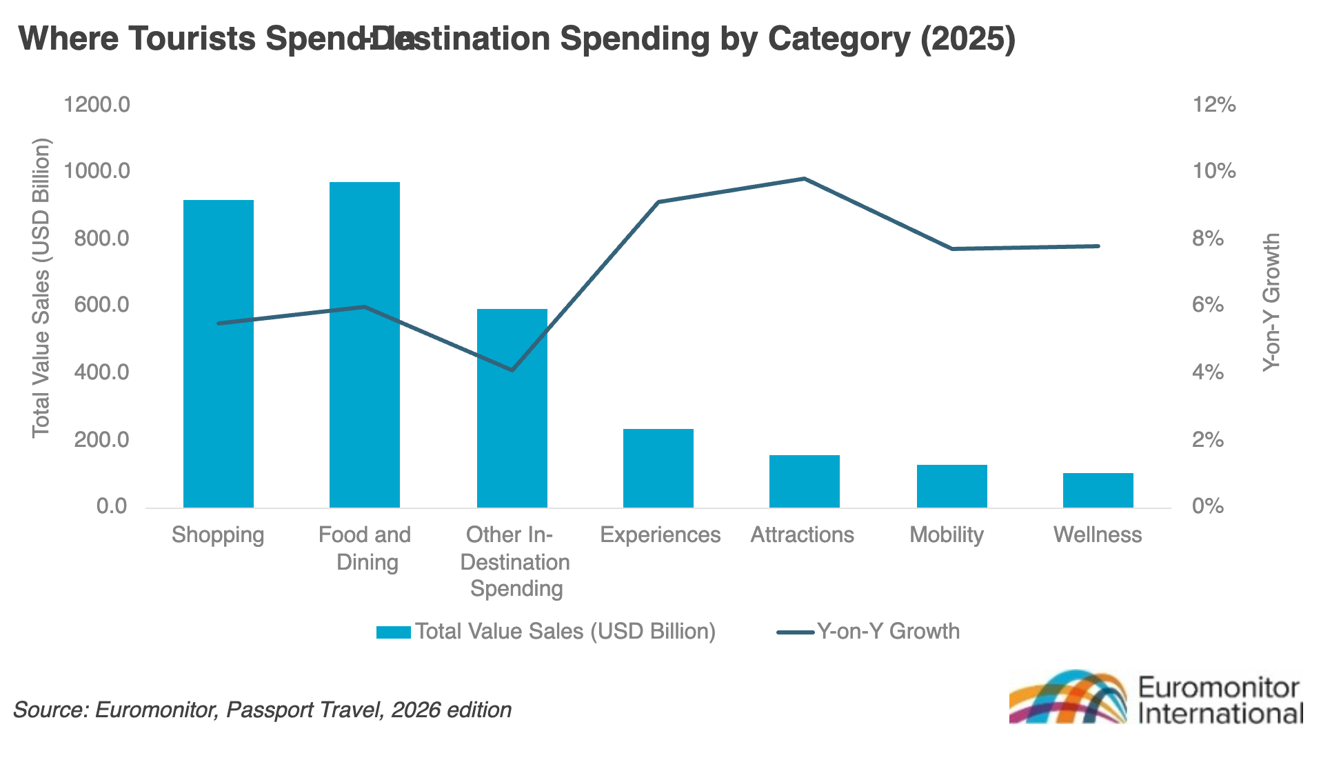A defining shift in global travel is the rise of purpose-driven and passion-led journeys. Travellers are no longer choosing trips solely for leisure; they are seeking experiences that align with their identities, interests and values. Euromonitor’s Voice of the Consumer: Travel Survey highlights this broadening of motivations, with travellers blending wellbeing, discovery and creativity within a single trip. This is reshaping demand well beyond traditional holiday packages. In-destination spending patterns reinforce this behavioural shift: attractions and experiences are among the fastest growing categories globally, signalling a move towards emotional fulfilment rather than purely transactional travel.