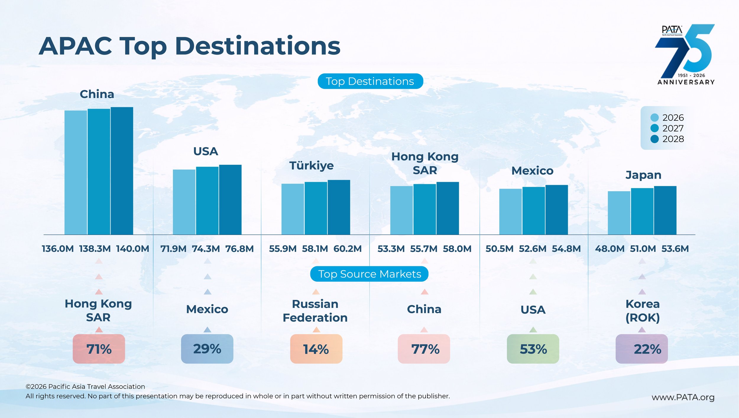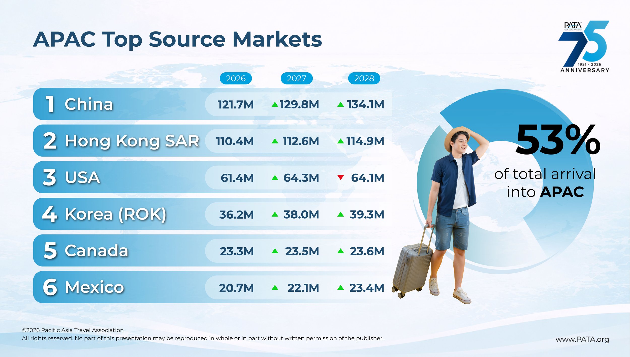 The PATA Asia Pacific Visitor Forecasts 2026–2028 is now available. Based on the level of membership, access may be granted either directly through the PATA Info Hub or via the PATA Publication using a discount code. To request the code or confirm membership level access, contact the PATA Membership Team at membership@PATA.org.